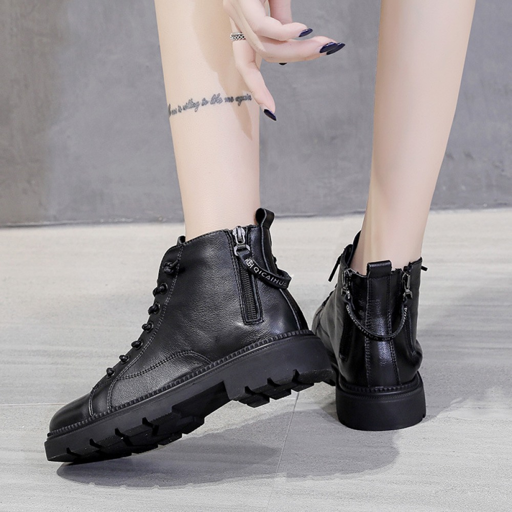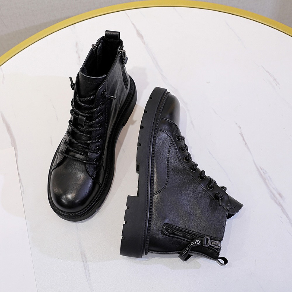 Women's Autumn New Thick-Soled Leather Boots Round Toe Thin Mid-Tube Martin Boots