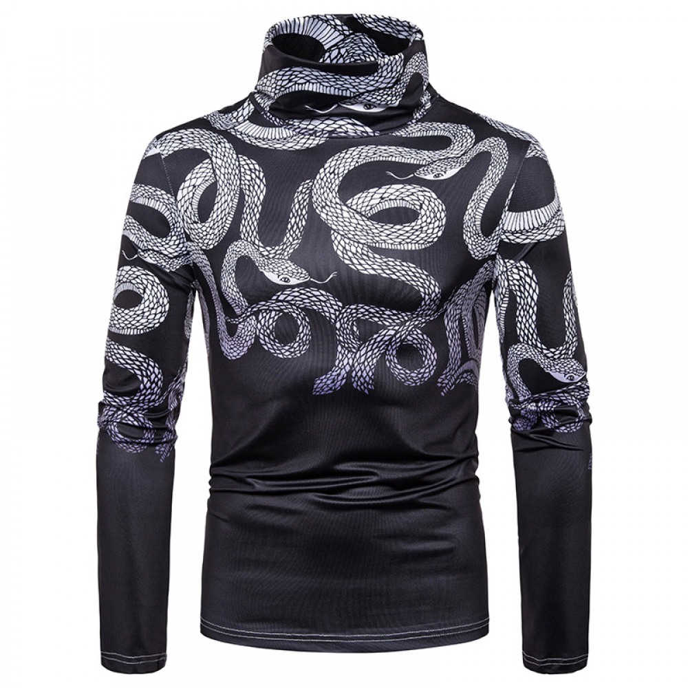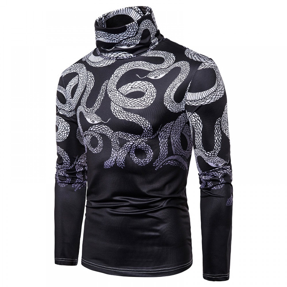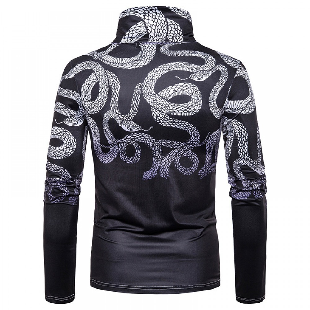 New Men's Large Size 3D Black and White Snake Print High Neck Long Sleeve T-Shirt Bottoming Shirt