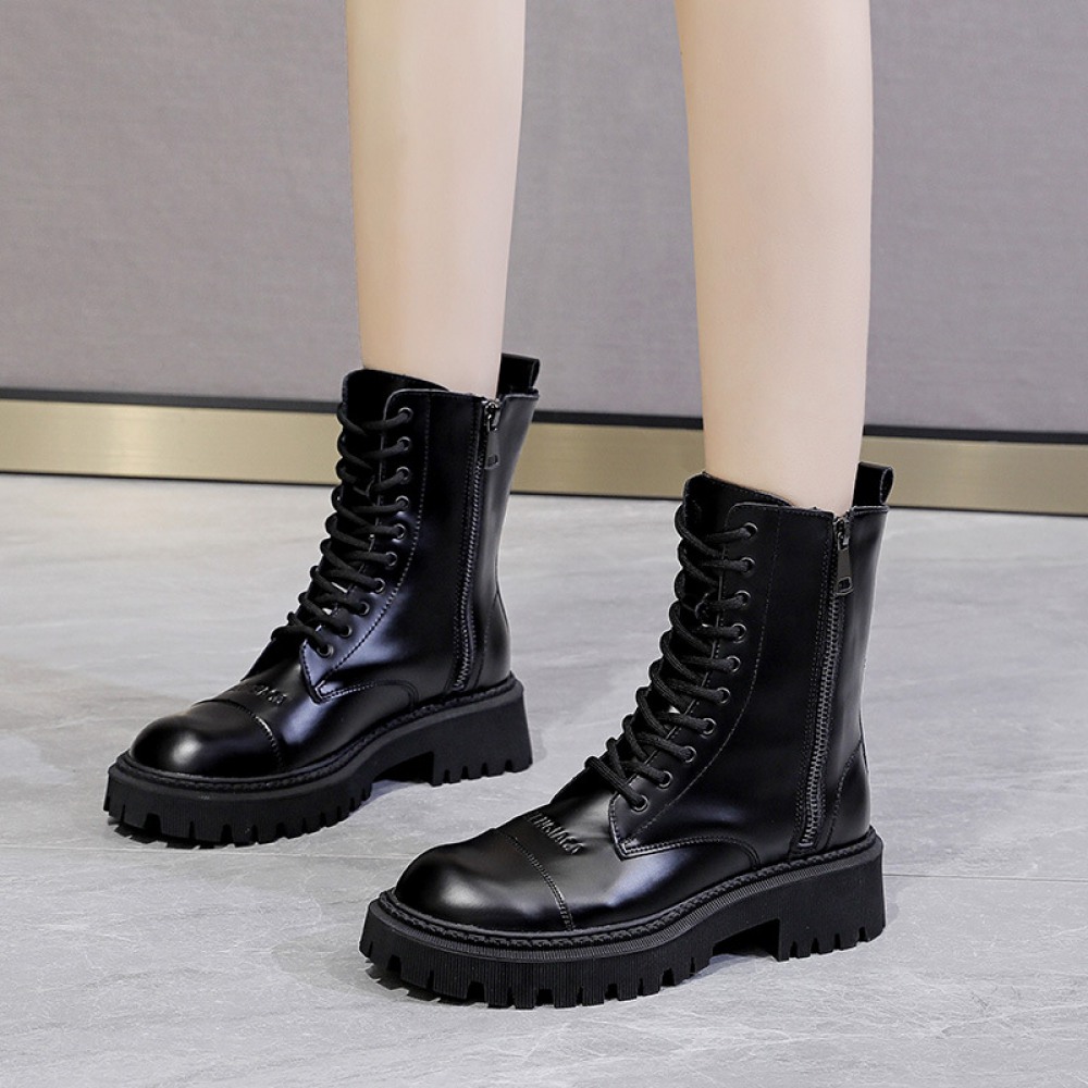 Women's Autumn New Thick-Soled Leather Boots Round Toe Thin Mid-Tube Martin Boots